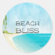 This round sticker features a calming coastal beach illustration with soft blue skies, tranquil turquoise water, sandy shoreline, and subtle palm tree accents, paired with the phrase “Beach Bliss.” Designed to evoke relaxed seaside charm, this minimalist ocean scene sticker is ideal for beach-themed packaging, envelope seals, planners, journals, party favors, and coastal lifestyle branding that values clean, serene aesthetics.