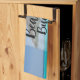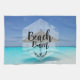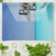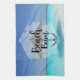 A kitchen towel with a tropical image of a turquoise sea with a white sandy beach and a single thatched beach umbrella. Typography says Beach Bum.