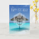 A happy birthday greeting card with a tropical image of a turquoise sea with a white sandy beach and a single thatched beach umbrella. Typography says Beach Bum.