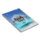 A spiral notebook with a tropical image of a turquoise sea with a white sandy beach and a single thatched beach umbrella. Typography says Beach Bum.