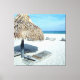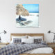 Get away with this relaxing vacation travel image of a white sand beach with palm front beach cabana and wood chaise chairs. Landscape with clear blue water and sky. A lovely coastal scene is a great way to take a mental break and have a day to day de-stress. All Designs Copyright © www.CuteComfy.com