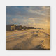 Souvenir photo magnet with a row of beach cabins on the North Sea beach of Kijkduin in the Hague during a nice sunset in the Netherlands.