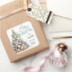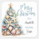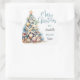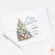 Add a warm and coastal touch to your holiday wrapping with this square Christmas gift tag featuring a watercolor Christmas tree made of beach shells, starfish, and coral. The tree is placed on the left side of the tag, resting in soft sand with teal blue water accents for a laid-back tropical feel. The color palette includes soft greens, tan, and coral-red tones for a relaxed, beachy vibe.