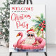 Welcome guests to your holiday celebration with this cheerful and tropical Christmas party welcome sign. The design features a laid-back Santa Claus wearing sunglasses and lounging in a pink flamingo floaty, surrounded by ocean waves and a palm tree with ornaments in the background—perfect for setting a fun and sunny tone.