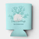 This personalized Beach themed Christmas can cooler features aqua blue glitter coral, white sand dollar and starfish, and the holiday message “Seas & Greetings”, on a light aqua blue background.