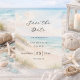 A watercolored sandy beach, sand dunes, ocean waves background. Personalize and add a date and your names. The text: Save the Date is written with a large trendy hand lettered style script.