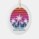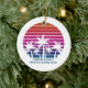 Cool custom beach sunset keepsake ornament for a destination wedding or family trip to an island. Cute personalized bridal party presents or family reunion gifts featuring a pretty pink background in front of beautiful palm trees.