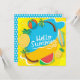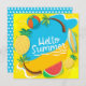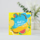 Fun summer beach scene with surfboard, pineapple, sunshine and watermelon. Blank on back for your personal note.