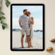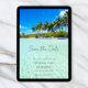 Tropical palm tree-lined beach wedding save the date card in a vertical layout. Customize with your wedding details on the front and add your vertical photo to the back.