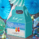 Beach wedding favor boxes with handles. Tropical blue color with an image on the front of two, frosty cocktails sitting on the sand. Names of the bride and groom can be added to the front with "thank you" on the box top. Fill with little gifts for guests at a wedding shower, engagement party or wedding reception.