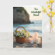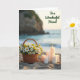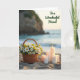 This design shows a rustic woven basket filled with white-and-yellow daisy-like flowers resting on softly rippled sand, with a gentle closeness in the way the blooms lean together ❤️. Nearby, several white pillar candles in different heights glow warmly, casting small pools of light that make the beach feel like a quiet spot shared between friends. The lighting is soft and golden, like early evening or dawn, and it smooths the scene with a calm, affectionate warmth 🌼. In the background, the ocean appears slightly out of focus in turquoise tones, with thin lines of white foam drifting toward shore. Farther back, a faint coastline with rocky shapes and touches of green sits under the hazy light. The message “To a Wonderful Friend” sits in the upper right area in green cursive-style lettering, light enough to feel airy against the sky. The candlelight reflects subtly on the sand grains around the basket, and the petals show delicate highlights along their edges. The tallest candle stands closest to the basket, with shorter candles clustered beside it on the sand.