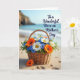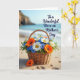 This card shows a rustic wicker basket overflowing with orange daisy-like blooms, crisp white flowers, and tiny blue florets, resting on a sunlit sandy beach with a gentle, affectionate feel ❤️. The woven texture of the basket contrasts with the soft petals and fine grains of sand, like a thoughtful gift set down with care. A softly blurred background shows a calm blue ocean meeting distant cliffs beneath a bright open sky, keeping your focus on the bouquet in the foreground. The natural light glows across the flowers and basket, giving the scene a tender, shared-moment look, as if two close friends just stepped away for a second. In the upper right, a short celebratory message appears in a flowing dark font that stands out against the pale sky. Subtle footprints and faint sand indentations nearby suggest someone lingered close, adding a quiet sense of connection 🌼. A single orange flower lies on the sand beside the basket, angled slightly toward it like it was just placed there.