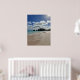 Embark on a journey along the pristine shores of Bermuda with our captivating photograph, where delicate footprints weave a path along the edge of the turquoise ocean. The iconic pink sand beach stretches out before you, inviting exploration and relaxation in equal measure. Gentle waves caress the shoreline, while volcanic rocks stand as silent sentinels against the backdrop of a vast, blue sky adorned with fluffy clouds.