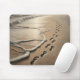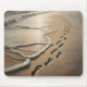 A tranquil beach scene features a series of footprints trailing off into the distance alongside the ebb and flow of ocean foam