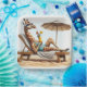 Cute giraffe lounging on a beach chair and drinking a cocktail