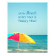 A photograph of a colorful beach umbrella with the saying "at the Beach every Hour is Happy hour".