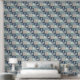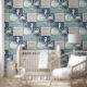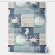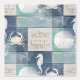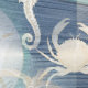 Vintage beach and sea themed images rendered in white and cream beige are arranged on an old wooden board background with squares tinted aqua, a deep and light blue, and soft white. Images in cream and white pictured are a crab, faint sea shells, sand dollar, sea horse and two soaring sea gulls along with the words "the Beach is my happy place". Makes a great beach and sea themed nautical wallpaper.