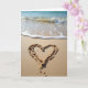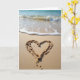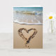 This greeting card shows a heart drawn into golden, wet sand at the edge of a sunlit beach, captured from a low angle that makes you feel close enough to trace the ridges with a fingertip. The heart’s raised edges cast small shadows, and the tiny grains around it sparkle as if they’re holding onto the moment 🥰. Behind it, the sea stretches out in bands of turquoise and cerulean, with sunlight flickering across the surface like scattered glass. A thin line of foamy white water rolls in, gently curving toward the heart as if the tide is leaning in for a kiss ❤️. The background is softly blurred so your eyes stay on the sand drawing, while the incoming wave adds a quiet sense of closeness and urgency. The text sits centered along the top in a soft white, with a smaller line near the bottom in light gray that doesn’t compete with the scene. In the foreground, the heart’s outline looks slightly darker where the sand is damp, and the wave’s lacey foam forms a bright, uneven edge just a short distance away.