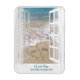 Names of couple in beach hearts and sand with frothy ocean surf and open window view.