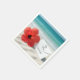 A vibrant red hibiscus flower lies delicately on the sandy beach next to an elegantly embossed blank white wedding envelope with names and wedding date.