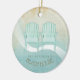 This ceramic ornament design in the soft colors of sea and sand allows you to easily add your own name and text using the provided template. The simple Adirondack chairs image on a distressed, watercolor background is highlighted by a wave accent in aqua and white. Search ID623 to see coordinating seaside elements and additional products with this design.