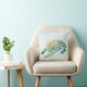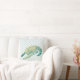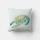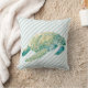 Beach house theme sea turtle pillow featuring a blue and white diagonal stripe background with watercolor sea turtle design on the front side of pillow, blue and white diagonal stripe on the backside of pillow. A beautiful throw pillow for bedding, seating area, sofa or patio.