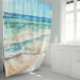 Abstract Beach Themed Painting Shower Curtain. Perfect for the cabin, cottage lake, or ocean side beach rental. It has a beautiful shoreline, waters edge painting in blues, teals and creams. Design by JennsEmporium.