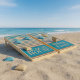 Beach House Cornhole Set with horizontal stripes in brown, beige and blue in a modern minimalist design style. The text can easily be customized with your own.