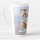 Tall latte mug with beach scene background. Customize with four photo templates and text along the bottom. A calm, blue sea and smooth beach sand is the background for sharing some fun photos of the kids, vacation, pets, and family time.