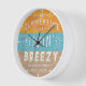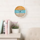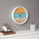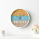 This cute, personalized wall clock is inspired by the beach and relaxing summer days. The all-white typography says, "Summertime and the Livin' is Breezy." The background is color-blocked with the top a sunny orange, the middle a wavy blue to look like ocean water and the bottom a sandy beige. The design has cute flourishes and white markings along the edge to tell the time.