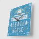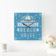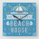 This elegant, personalized beach house square clock will add a unique custom touch to your coastal decor. The one-of-a-kind design is made to resemble blue wood grain with white text and elegant flourishes in shades of brown and golden yellow. At the top, the design includes a sailboat on the waves, seagulls flying past. Nautilus shells surround the "Beach House" text, which is made to look slightly worn.