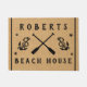 "Beach house" text with canoe paddles, anchors, starfish, and your family name - faux rustic burlap background with black