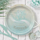 This paper plate in the soft colors of sea and sand allows you to easily add your own name and text using the provided template. A supplied white frame is optional. The simple palm trees image on a distressed, watercolor background is highlighted by a wave accent in aqua and white. Search ID623 to see coordinating seaside elements and additional products with this design.