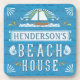 These beachy drink coasters are perfect for resting your cold beverage on a hot summer day. The unique, personalized design is made to resemble blue wood grain with white text and elegant flourishes in shades of brown and golden yellow. At the top, the design includes a sailboat on the waves, seagulls flying past. Nautilus shells surround the "Beach House" text, which is made to look slightly worn.