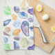A fun kitchen towel decorated with a collection of seashells hand drawn with ink and watercolor including oyster shells, bubble shells, clam shells and more with a watercolor spatter background. Great gift for a friend who collects seashells!