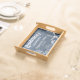 A super cute beach house serving tray featuring vintage sea shells, coral, starfish and sea urchin set against a nautical blue faux wood background. Add 4 lines of custom text to personalize. Perfect for a beach house, ocean side vacation rental, beach wedding, housewarming gift and more.