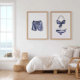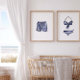 This charming set of two vintage-inspired swimsuit prints features a navy and white striped bikini and matching trunks in soft watercolor style. Perfect for creating a breezy coastal atmosphere, these nautical wall prints add a touch of summer nostalgia to any room.
