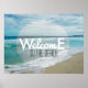 This beach house welcome poster wall art has text on beach shore ocean photograph. Original photograph copyright Ann Powell all rights reserved.