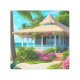 A Beachhouse with a ocean view, tropical landscaping with palm trees and tropical flowers and a yellow cat asleep on the porch. Home decor for your house.
