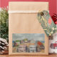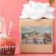 This sticker features an original oil painting by Anna Unterman of a little island off the New Jersey shore. A whimsical grouping of beach houses is clustered around a central sandy courtyard with a colorful clothesline full of laundry blowing in the breeze. Each house is a different pastel color: pink, blue, white, green and brown. The bay is in the background with one sailboat. The sky is partly cloudy. Reprinted with permission from the estate of Anna Unterman. All rights reserved.