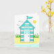 Beach Hut, painted light blue and white , standing in the sand dunes on the beach in the summer sun.