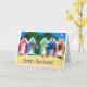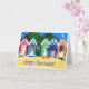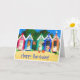 A handpainted paper collage of beach huts for a bright and colourful birthday card. Blank inside for your own message.