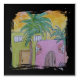 Two colorful beach huts and palm trees, a mixed-media work of art, are exhibited as a paint swatch, a most interesting presentation.