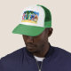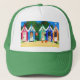 A green and white trucker-style hat, decorated with a handpainted paper collage design of beach huts.