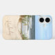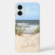 Tropical beach themed phone case with a photo of the seashore with sand dunes and sea grasses, with waves in the background and customizable name or text of your choice.