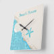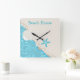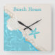 Beach themed kitchen wall decor clocks designed with a graphic image of beach sand, a scallop seashell, and starfish with tide water in an abstract depicting of a coastal scene. Created for a beach house or any home decor that can use a nautical design.