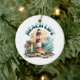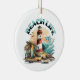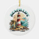 Beach themed Christmas ornament. Illustration of a beachy scene with lighthouse, surfboards, palm trees and dolphin.
