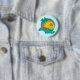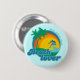 Button design for beach lovers with colorful illustration of palm trees, dolphins, sea and environmental slogan. Customizable, you may change the background color.