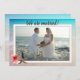 Flat photo template card with beach theme for announcing a marriage. Newlyweds, who were married in a private ceremony, can share a photo of the special event and tell friends and family when and where it happened. Upload a large horizontal photo to the front, framed in off-white and printed over a beach scene background. A pink plumeria flower and brown sea star / starfish decorate the corner of the frame. "We are married!" text at the top can be changed, with all other information printed on the back. Can be used to simply announce the marriage, or include invitation text to a reception for the newlyweds.