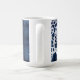 "Beach Ocean Navy Blue White Seahorse Coral Wood, Coastal home decor coffee mug." A seahorse is swimming near a white tree coral, both are silhouettes that have been rendered in white rustic wood and are placed over a navy wood background and were painted in watercolors by internationally licensed artist and designer, Audrey Jeanne Roberts, copyright